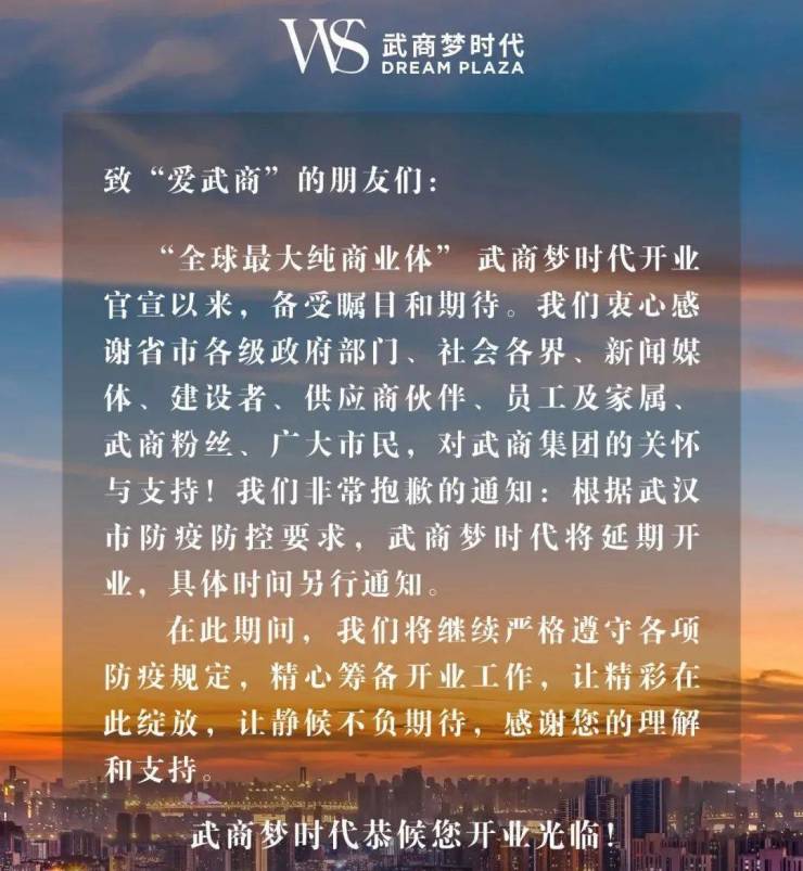 我们非常抱歉的通知∶根据武汉市防疫防控要求,武商梦时代将延期开业,具体时间另行通知。在此期间,我们将继续严格遵守各项防疫规定,精心筹备开业工作,让精彩在此绽放,让静候不负期待,感谢您的理解和支持。
