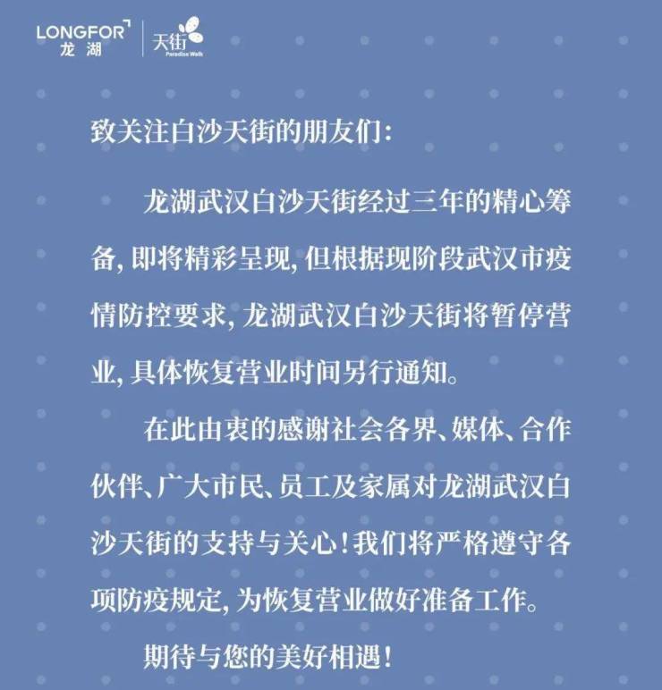 另外,原计划10月28日开业的龙湖武汉白沙天街官微发布了:武汉白沙天街暂停营业通知。据通知内容显示: