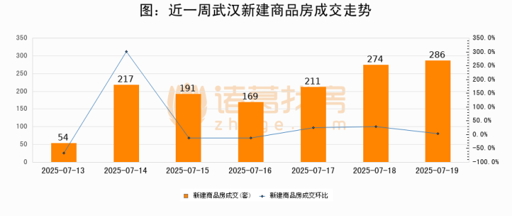 根据武汉市住房保障和房屋管理局数据显示,2025年07月19日武汉新建商品房成交286套,较昨日增加12套,环比上涨4.4%