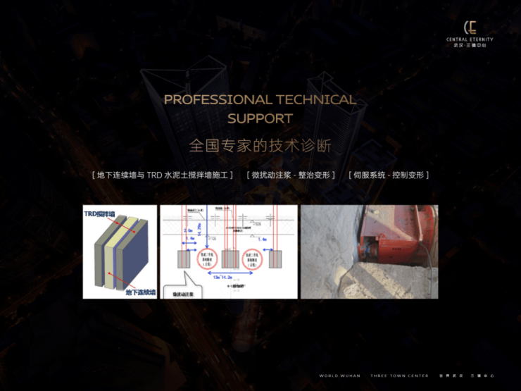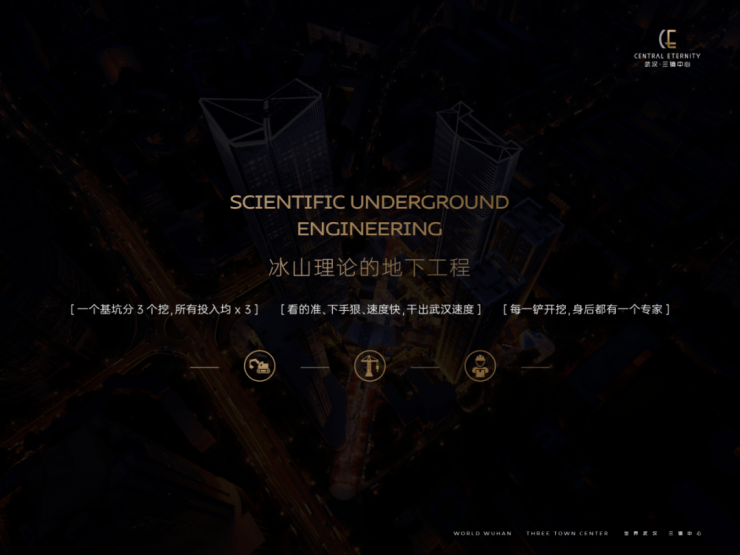 三镇中心项目被轨道交通2号线斜穿而过,分为南北两个地下室。通过3块交通走廊将南北两个地块链接起来。但在运营地铁正上方建设如此规模的交通走廊,在武汉地区尚属首次。