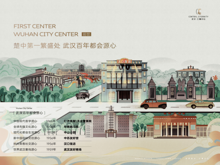 从汉口初生,开卷武汉三镇雄图;到汉口开埠,开启近现代都市进程;武汉·三镇中心所在的黄金十字路口,始终策源、引领、影响着武汉乃至中国的前行的脚步。这幅图是《江汉揽胜图》又名《武汉三镇图》反应的是当时繁荣的盛况,现在我们项目也叫武汉·三镇中心,传承汉口百年的繁盛。