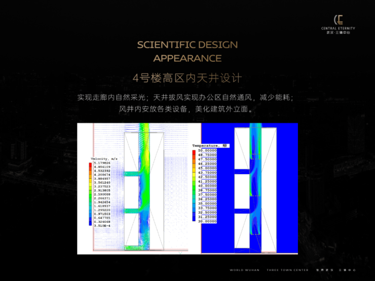 4号楼为总建筑高度249米的塔式办公楼,设计中充分考虑绿色建筑技术运用,减少建筑能耗,降低碳排放。其在办公楼高区,32层~56层,设计有一个内天井,实现三种功能:一是实现办公内走廊的自然采光,减少人工照明;二是利用烟囱效应原理,利用内天井拔风,在春秋季可实现办公区的自然通风,减少空调开启时间;三是此空间内巧妙放置了各层空调室内机,确保了建筑外立面的整洁美观。为确保内天井空间的有效利用,全程采用CFD技术,计算不同形态的天井对建筑内外空气温度,速度的影响,确保设计最优化。