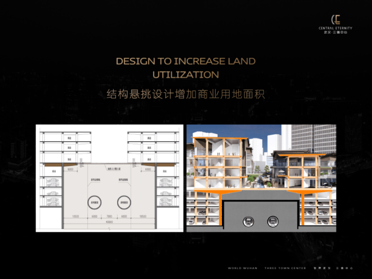 武汉轨道交通2号线将整个场地跨中分为南北两块,按规定地铁线40米宽影响线范围内的附加荷载不得大于20千牛每平方米,相当此范围内只能建一层的房子。为了提高土地利用率,采用悬挑转换的方式将影响线范围内荷载转移到影响范围以外。最终使得影响线范围内可建4层高商业建筑提高商业用地面积。