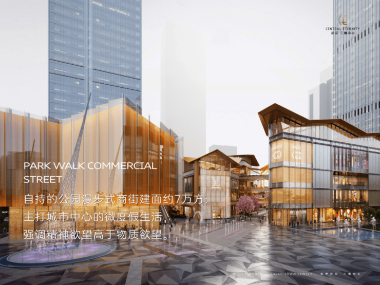 自持的公园慢步式商街建面约7万方:主打城市中心的微度假生活,强调精神欲望高于物质欲望。