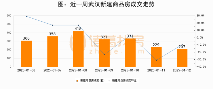 根据武汉市住房保障和房屋管理局数据显示,2025年01月12日武汉新建商品房成交207套,较昨日减少22套,环比下降9.6%。近一周武汉新建商品房日均成交310套。01月12日单日成交207套,低于近一周平均水平33.2%。