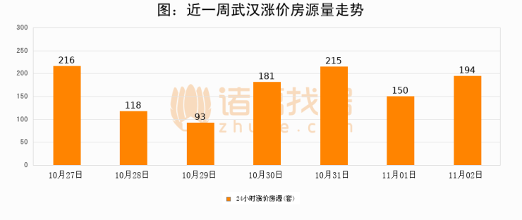 根据诸葛找房数据显示,武汉24小时涨价房源量为194套,较11月01日增加44套,环比上涨29.3%。与此同时,涨价房源占比小幅扩大,业主信心有所提升。