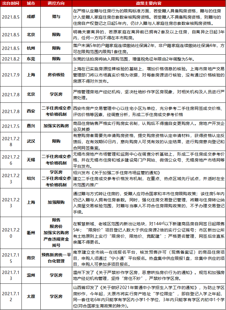近日,北京、成都、杭州、东莞等地陆续发布楼市调控政策,意在为楼市降温,其中,北京和成都的政策分别针对离婚和赠与类客群,政策虽小,贵在精准,而杭州楼市则通过延长社保年限,进一步升级限购。