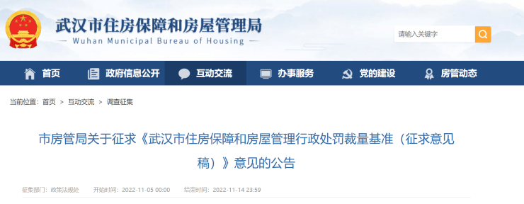 搜狐焦点“楼市快讯”报道:11月4日,武汉市房管局发布了关于征求《武汉市住房保障和房屋管理行政处罚裁量基准(征求意见稿)》意见的公告。《公告》显示,为进一步规范武汉市住房保障和房屋管理行政处罚自由裁量权的行使,确保依法行政,保护公民、法人或者其他组织的合法权益,武汉市房管局起草了《武汉市住房保障和房屋管理行政处罚裁量基准(征求意见稿)》,现予以公开征求意见。根据《武汉市行政规范性文件管理办法》要求,本次征集意见的期限为10日(2022年11月5日—2022年11月14日)。