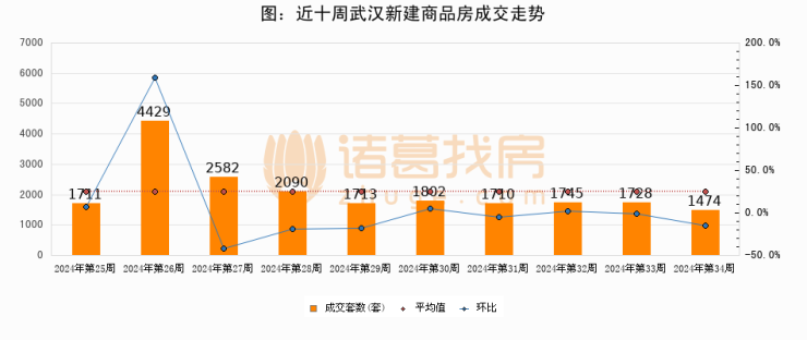 进入2024年第34周(08月19日-08月25日),武汉新建商品房成交1474套,较上周减少254套,环比下降14.7%