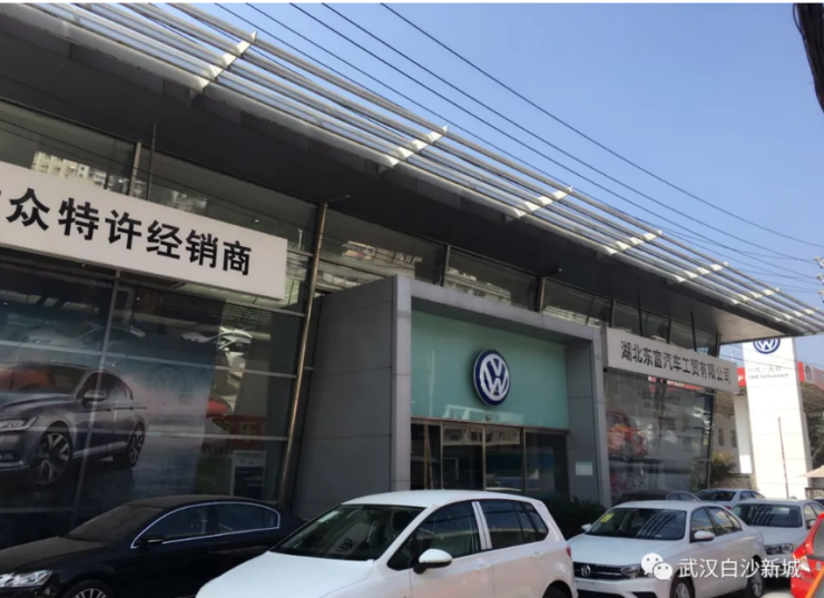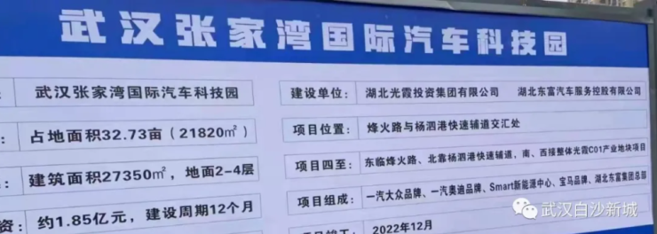 该效果图同步公示,公示牌显示,项目组成为一汽大众品牌、一汽奥迪品牌、Smart新能源中心、宝马品牌、湖北东富集团总部,竣工时间为2022年12月。