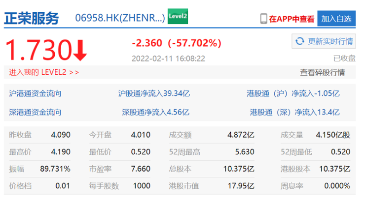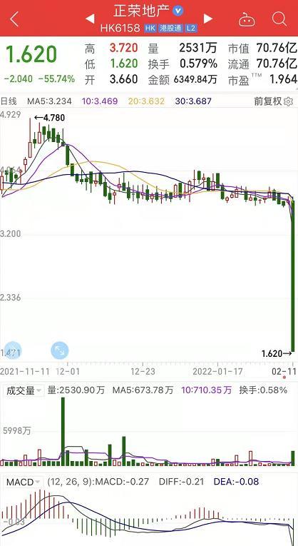 此后两只股票跳水后出现小幅回升。截至收盘,正荣地产跌66.4%收于1.23港元/股,正荣服务跌57.7%收于1.73港元/股。