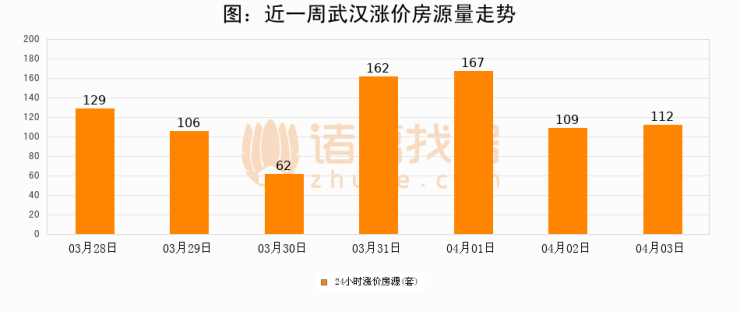 根据诸葛找房数据显示,武汉24小时涨价房源量为112套,较04月02日增加3套,环比上涨2.8%。与此同时,涨价房源占比小幅扩大,业主信心有所提升。