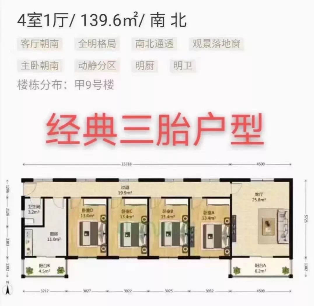 这张图片展示的户型,面积为139平方米,采取4室1厅设计,四个卧室沿过道一字排开,户户朝南。这一设计能保证每个小孩都能拥有一间朝南房间,公平公正。