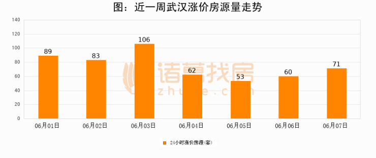 根据诸葛找房数据显示,武汉24小时涨价房源量为71套,较06月06日增加11套,环比上涨18.3%。与此同时,涨价房源占比小幅扩大,业主信心有所提升。