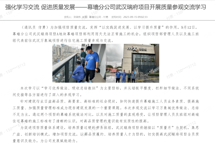 武汉瑞府项目通过公司内部平台进行“质量月”质量宣传。