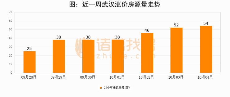 根据诸葛找房数据显示,武汉24小时涨价房源量为54套,较10月03日增加2套,环比上涨3.8%。与此同时,涨价房源占比小幅扩大,业主信心有所提升。