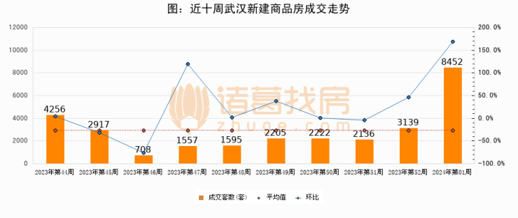 进入2024年第52周(12月25日-12月31日),武汉新建商品房成交8452套,较上周增加5313套,环比上涨169.3%