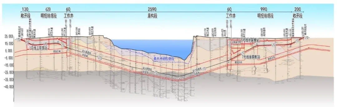 该隧道工程由城市道路隧道、两座地铁车站和一个地铁区间3部分组成。其中穿越长江段和两岸地铁车站段采用同结构合建方案,合建段总长度3280米,其余地段采用上下层结构分离方案。公轨合建盾构段总长2590米,隧道外径达到15.2米,相当于五六层楼高。