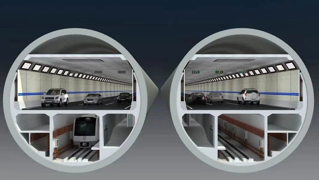 三阳路长江隧道工程是城市道路隧道与地铁7号线隧道共用的穿越长江的通道工程,二者上下重叠布置,减少项目用地面积约16万平方米,节约工程投资约8亿元;同时,该项目对公轨合建断面形式进行了公铁共用疏散通道、轨道交通排烟道分段布置等大量创新,从而使得隧道断面利用率高达95%,相比同类型盾构隧道断面利用率提高约20%。