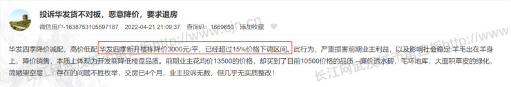 华发四季业主反映的另一个问题,则是关于楼盘降价幅度过大。公开资料显示,该楼盘于2019年7月28日首开,当时毛坯均价约13500元/平,如今新开楼栋所推房源直接降价3000元/平。