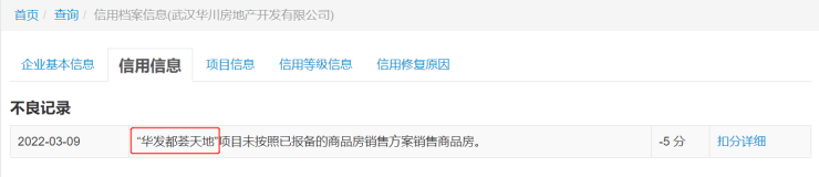除了维权声音四起的华发四季,销量红盘华发都荟天地也出现了问题。在武汉市住房保障和房屋管理局公布的3月份房企信用扣分情况中,华发都荟天地由于未按照已报备的商品房销售方案销售商品房,而被扣掉5分。