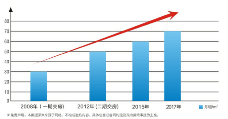 东合中心经过多年醇熟发展,表现出稳定的租金增长趋势,带来升值空间与收益的持续稳定发展。月租从最初的约30元/㎡上涨到约70元/㎡,上涨幅度达到130%。东合中心三期准现楼,实景跃然呈现,财富机会,无需等待。
