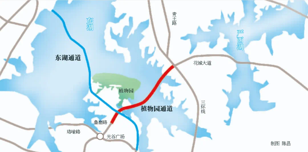 值得一提的是,植物园通道与东湖隧道呈十字交叉,形成武汉首条“立交隧道”。同时,这两条下穿东湖的隧道规划了匝道,可实现互通。植物园通道完工后,东湖与严西湖可实现“牵手”,花山新城与武昌、光谷市民三地实现连通。