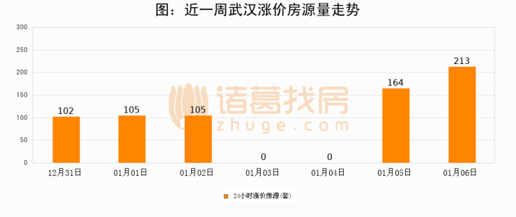 根据诸葛找房数据显示,武汉24小时涨价房源量为213套,较01月05日增加49套,环比上涨29.9%。与此同时,涨价房源占比小幅扩大,业主信心有所提升。