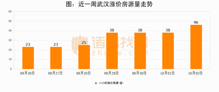 根据诸葛找房数据显示,武汉24小时涨价房源量为46套,较10月01日增加8套,环比上涨21.1%。与此同时,涨价房源占比小幅扩大,业主信心有所提升。