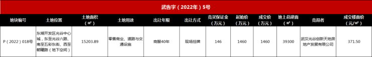 6月14日消息,搜狐焦点获悉,据武汉土地网消息,6月7日,武汉光谷创新天地房地产发展有限公司以底价1460万元,竞得东湖开发区光谷中心城,东至光谷六路、南至五彩东街、西至朝曦路(地下空间)P(2022)018号地块。