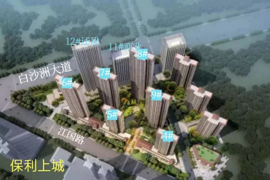 位于保利上城的正北面,江国路和白沙洲大道交汇处。净用地面积4.6万方,总建筑面积24.6万方,商业面积4.3万方,居住面积13.9万方,容积率3.94,绿地率40%,总户数1295户,停车位1666个,其中地上11个,地下1655个,户均107平。