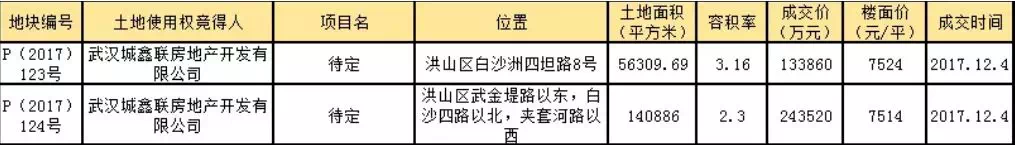 2017年12月4日,洪山区白沙洲四坦路、白沙四路编号P(2017)123号、P(2017)124号两宗地块出让,这两宗地块均被武汉城鑫联房地产开发有限公司拿下,成交价分别为13.38亿、24.35亿,楼面价分别为7524元/平、7514元/平。
