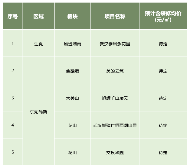 大汉口 10月预计17个项目有供应,总共2900余套。一共有4个新盘,均位于汉口三环内。汉口滨江板块的电建汉口公馆,位处汉口历史风貌区内黄石路与铭新街交汇处,步行可乘1、2、6号轨交。规划有5栋4-11层住宅,产品风格为中西结合的红砖花园洋房,容积率仅2.29。预计首开供应111-143㎡三四房产品;二七板块的中建壹品汉芯公馆紧邻武汉天地商业圈,规划了8 栋住宅,业态为小高层和高层,容积率2.58%,项目毛坯销售,预计10月底首开;后湖板块有两新盘均于十一期间入市,其中武汉城建万科云泊江岸微观区位相对较好,首开推售3栋高层,主力面积段为108-143㎡三四房。