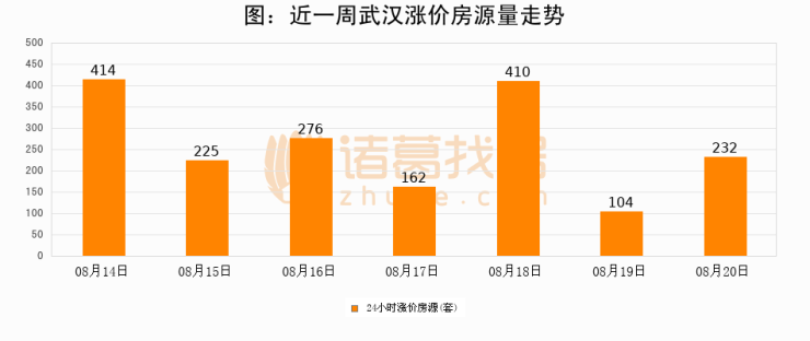 根据诸葛找房数据显示,武汉24小时涨价房源量为232套,较08月19日增加128套,环比上涨123.1%。与此同时,涨价房源占比小幅扩大,业主信心有所提升。
