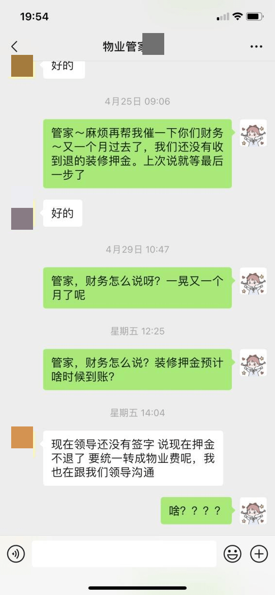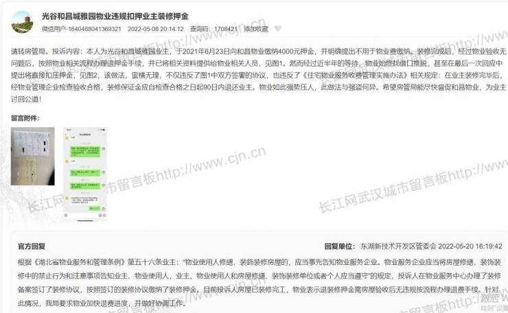 除了漏水问题,还有业主投诉“光谷和昌城雅园物业违规扣押业主装修押金”。业主在与物业沟通过程中明确表明所交钱款属于装修押金,不用于物业费也不可转成物业费。但在多次沟通中,光谷未来城物业方多次推诿,在最后一次沟通中直接告知业主装修押金转为了物业费。