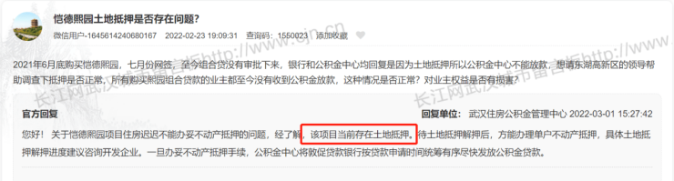除此之外,在武汉留言板上可以看到有网友留言投诉:“恺德熙园存在土地抵押情况,但项目方在未解除抵押的情况下就售卖房源。”