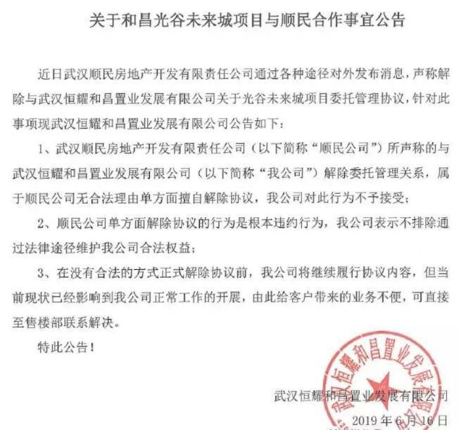 在和昌被撤资、解约的消息曝光后不久,6月16日,和昌在其官方公众号“武汉和昌”上发布公告:解除协议属于顺民单方面的违约行为,在没有合法的方式正式解除协议前,和昌会继续履行协议内容,给业主带来的不便,可以直接与售楼部联系解决。