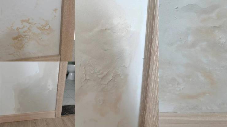 从业主提供照片可以看出,卫生间外侧墙面出现了大面积起皮,且呈现潮湿状态。
