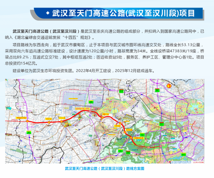 武汉至天门高速公路(武汉至汉川段)是武汉至重庆高速公路的组成部分,拟纳入到国家高速公路网中,已纳入《湖北省综合交通运输发展“十四五”规划》。本项目路线为东西走向,起于武汉市蔡甸区,止于本项目与武汉城市圈环线高速交叉处,路线全长53.127km,采用双向六车道高速公路标准建设。项目总投资约154亿元,预计2025年12月建成通车。