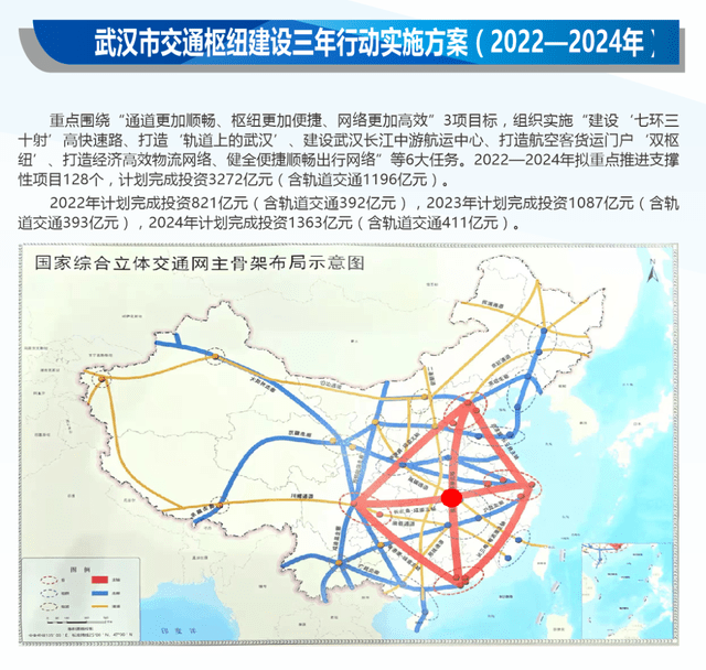 围绕“通道更加顺畅、枢纽更加便捷、网络更加高效”的目标,武汉市交通运输局制定了《武汉市交通枢纽建设三年行动实施方案》。将组织实施“建设‘七环三十射’高快速路、打造‘轨道上的武汉’、建设武汉长江中游航运中心、打造航空客货运门户‘双枢纽’、打造经济高效物流网络、健全便捷顺畅出行网络”等6大任务。2022年至2024年计划实施支撑性项目128个,计划完成投资3272亿元。