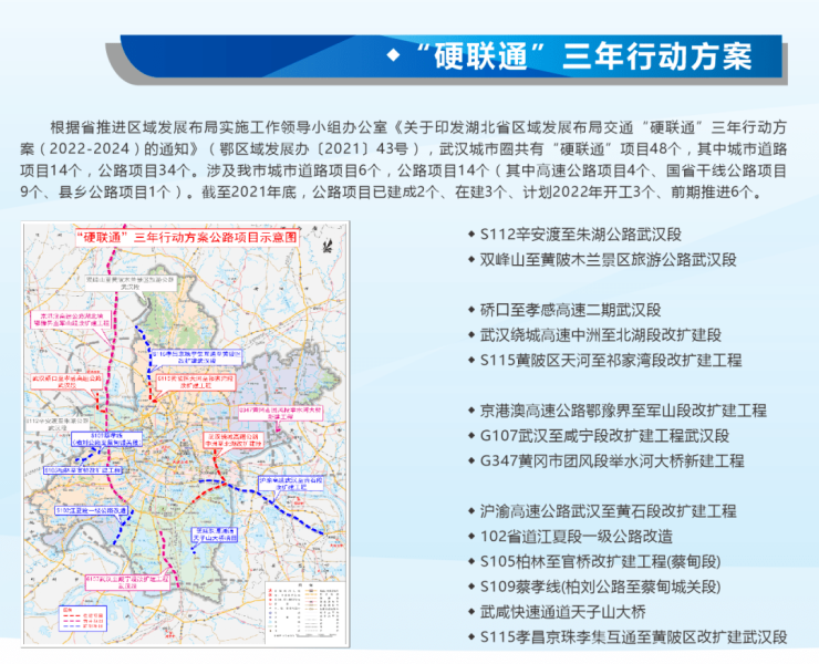 涉及武汉市城市道路项目6个,公路项目14个(其中高速公路项目4个、国省干线公路项目9个、县乡公路项目1个)。截至2021年底,公路项目已建成2个、在建3个,计划2022年开工3个、前期推进6个。