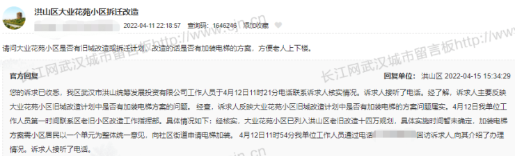 洪山区:经核实,大业花苑小区已列入洪山区老旧改造十四五规划,具体实施时间暂未确定,加装电梯方案需小区居民以一个单元为整体统一意见,向社区街道申请电梯加装。