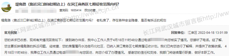 网友:堤角路(靠近汉口新城2期边上)在滨江商务区七期征收范围内吗?是否有拆迁的规划?
