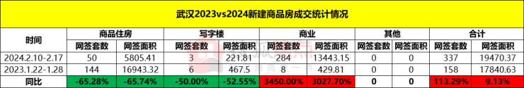 据武汉房管局数据显示,2024年春节期间(2月10日-2月17日),武汉市新建商品房成交备案336套,成交面积19470.37平方米。其中新建商品住宅成交50套,成交面积5805.41平方米;新建写字楼成交3套,成交面积221.81平方米;新建商业成交284套,成交面积13443.15平方米。