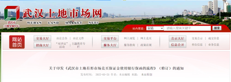 通知显示,为了进一步优化营商环境,助力武汉市经济建设快速恢复,根据湖北省人民政府印发的《全力做好自然资源要素保障服务经济社会加快恢复发展若干措施》(鄂政办发〔2020〕19号)文件精神。在原有以土地竞买保证金交纳作为参加土地竞买履约保证的基础上,增加银行保函作为参加土地竞买的履约保证方式。
