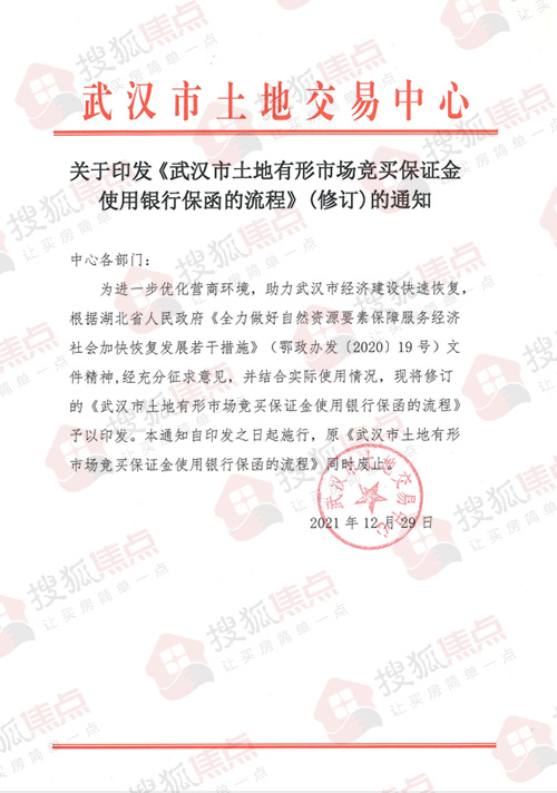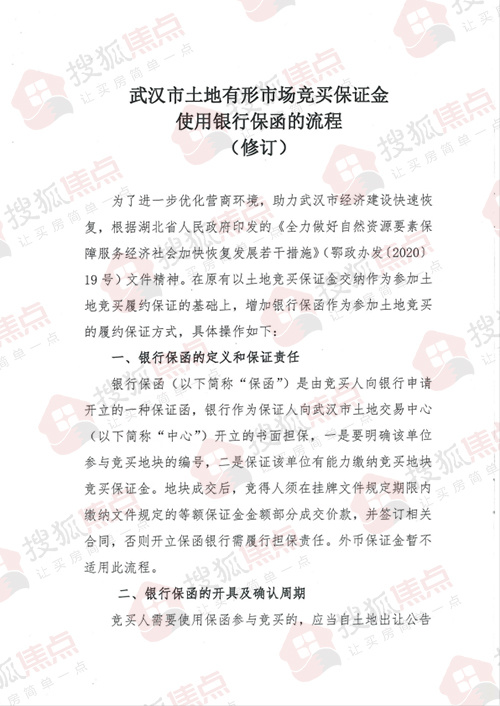 搜狐焦点“楼市快讯”报道:3月25日,搜狐焦点获悉,武汉市土地交易中心印发了关于《武汉市土地有形市场竞买保证金使用银行保函的流程》(修订)的通知。
