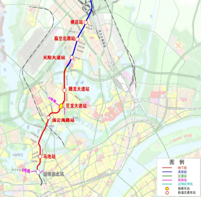 由园博园北站(不含)至横店站,全长21.12km,共7座车站:马池站、汤云海站、巨龙大道站、腾龙大道站4座车站为地下站;天阳路站、临空北路站、横店站3座车站为高架站。其中,换乘站有2座:巨龙大道站可与既有2号线换乘,天阳路站预留天河机场枢纽方向接轨条件。