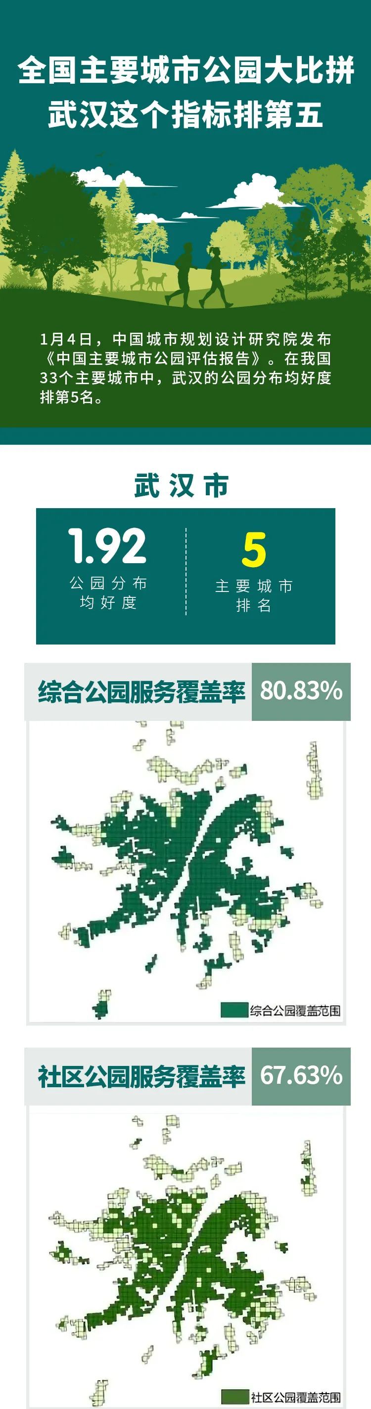 报告显示,武汉市公园分布均好度为1.92,在33个主要城市中排名第5位。