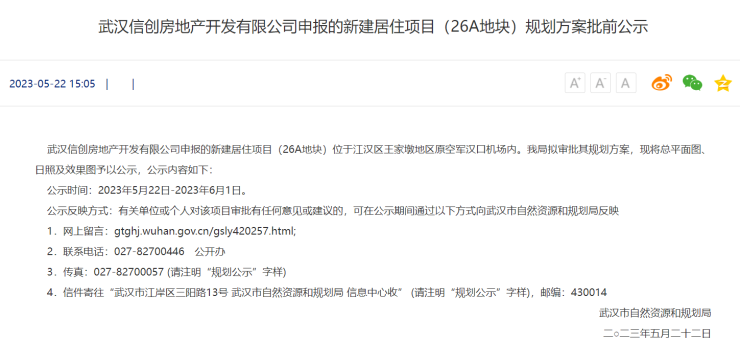 搜狐焦点获悉,5月22日,据武汉市自然资源和规划局,武汉信创房地产开发有限公司申报的新建居住项目(26A地块)规划方案批前公示。本次申报项目(26A地块)位于江汉区王家墩地区原空军汉口机场内。
