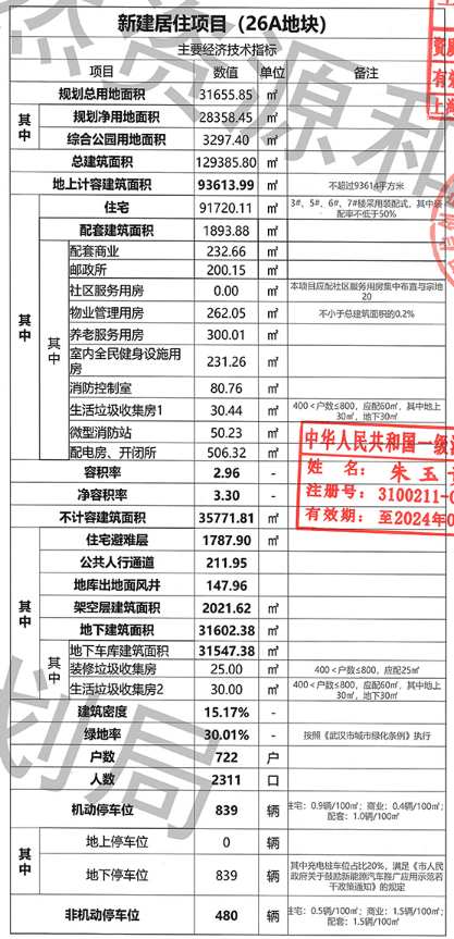 规划建筑密度15.17%,容积率2.96,绿地率30.01%;规划722户,机动停车位839辆(均为地下停车位),非机动车停车位480辆。